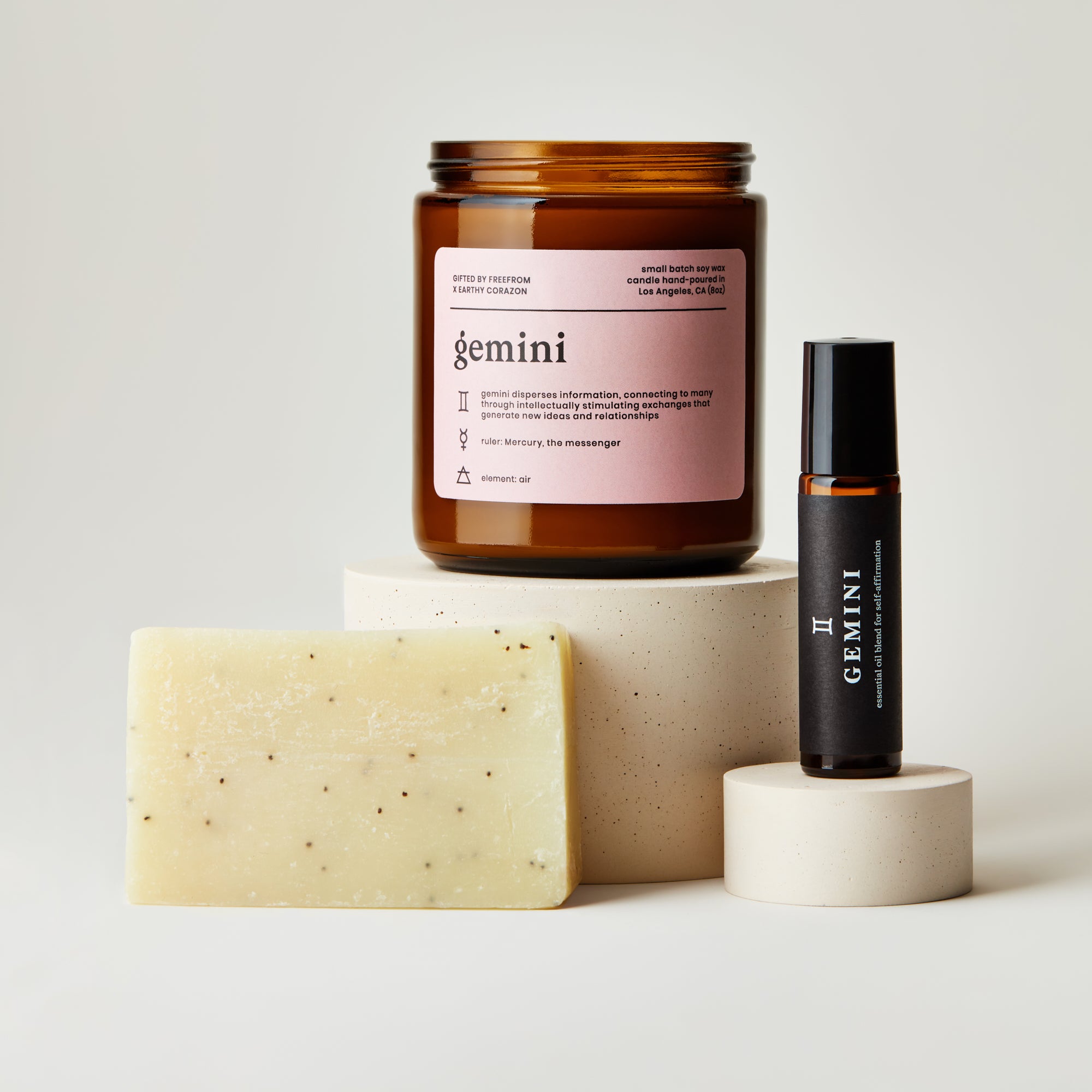 Celebrate the magic of Gemini. This self affirmation box for Gemini contains a Gemini candle, peppermint soap, and a Gemini essential oil blend.