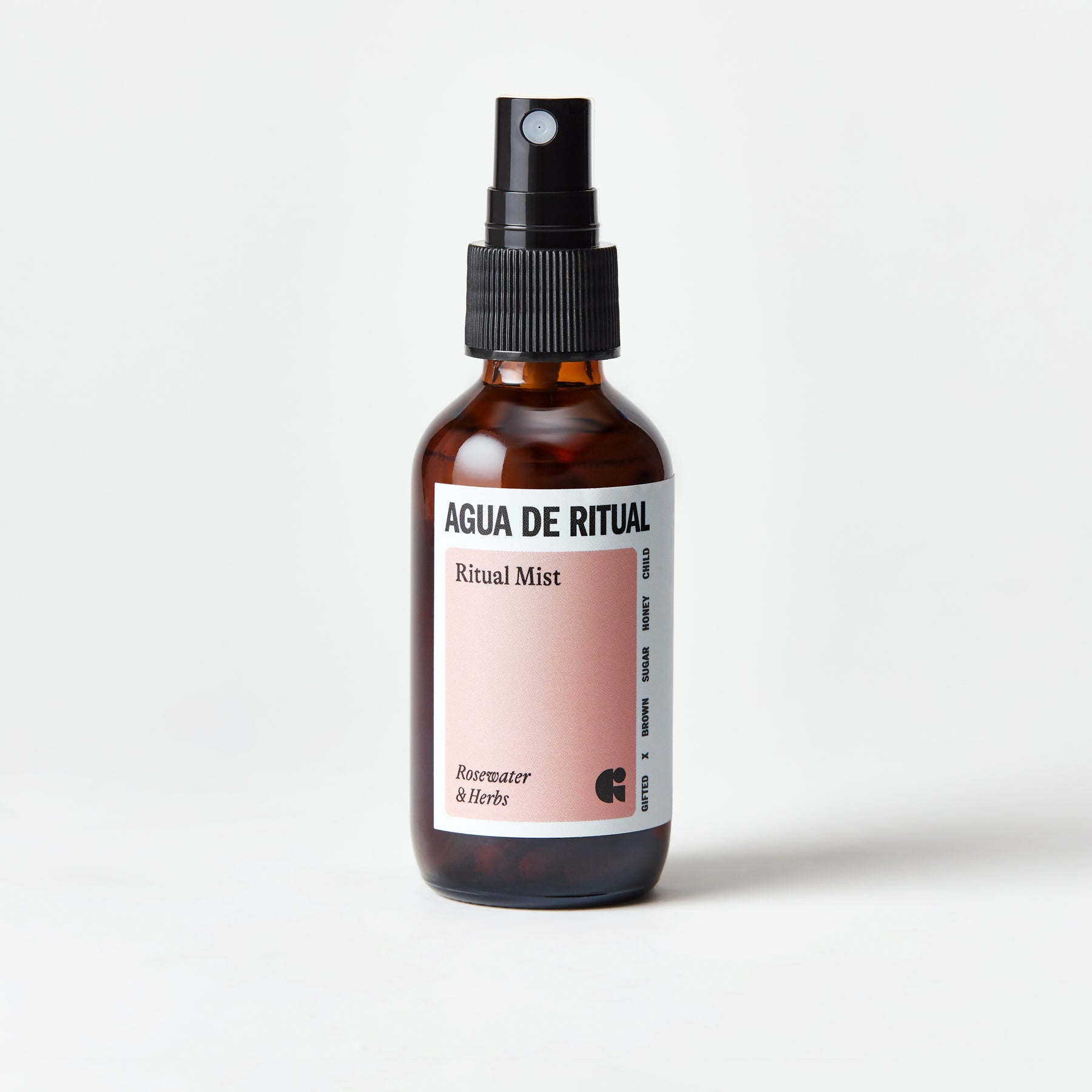 Agua De Ritual Mist handmade by Brown Sugar Honey Child: rosemary, cinnamon, clove, vetiver, sage, and lavender essential oils soaked in rose water.