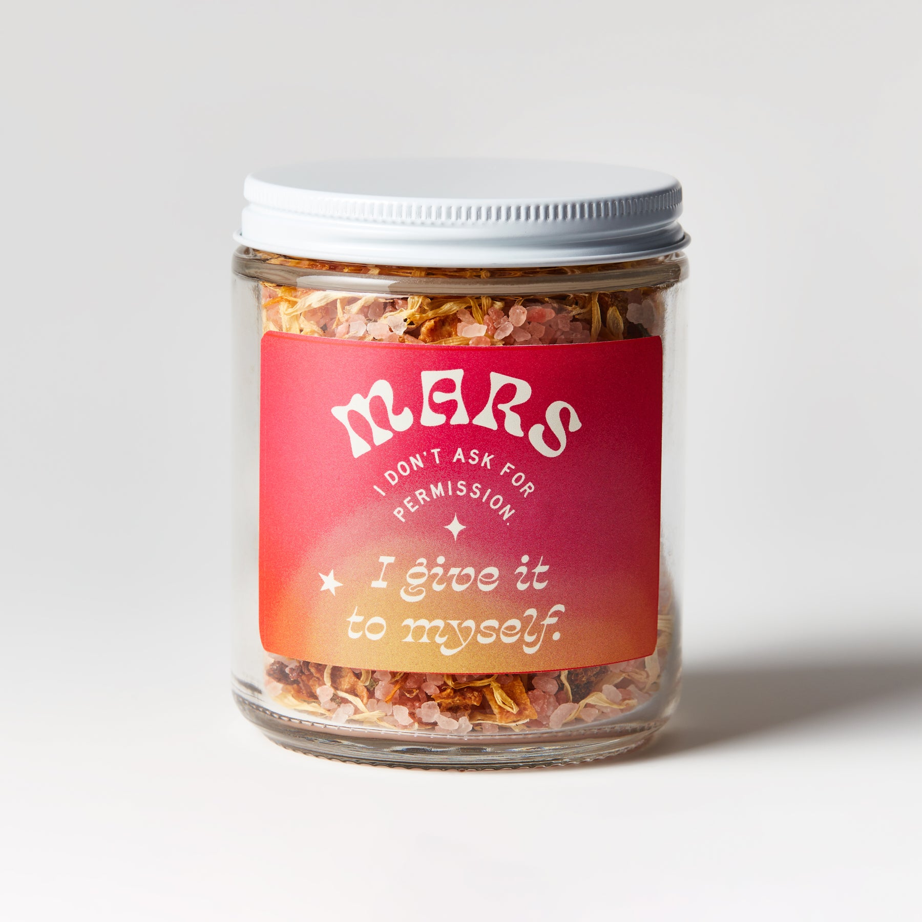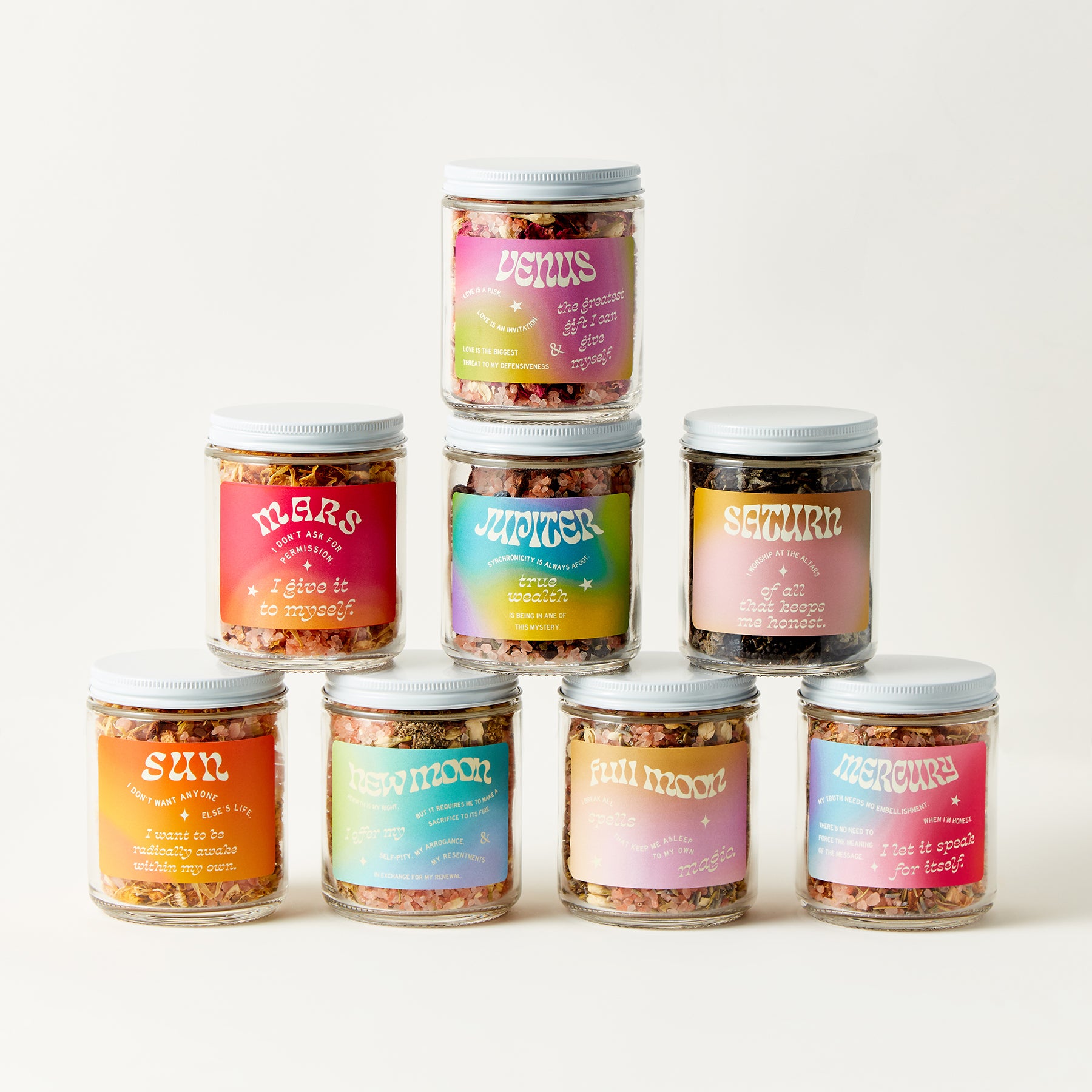 Mars — These bath salts promote courage, strength, and passion. They’re made with Himalayan pink salt, organic nettle, organic calendula petals, organic orange peel, and organic ginger essential oil.