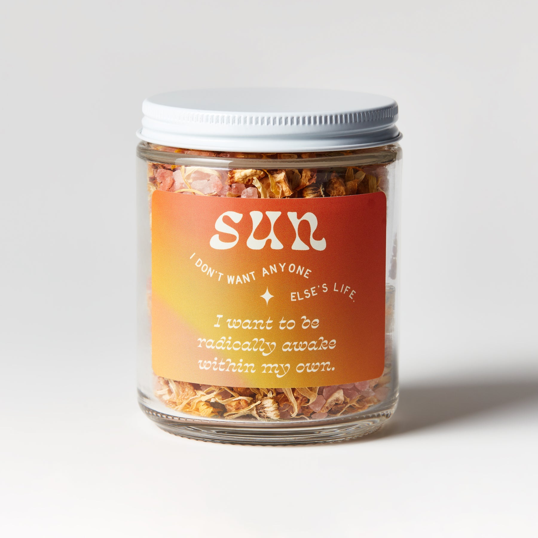 Sun — These bath salts support vitality, energy, and confidence. They’re made with Himalayan pink salt, organic orange peel, organic lemon peel, organic calendula petals, and organic sweet orange essential oil.