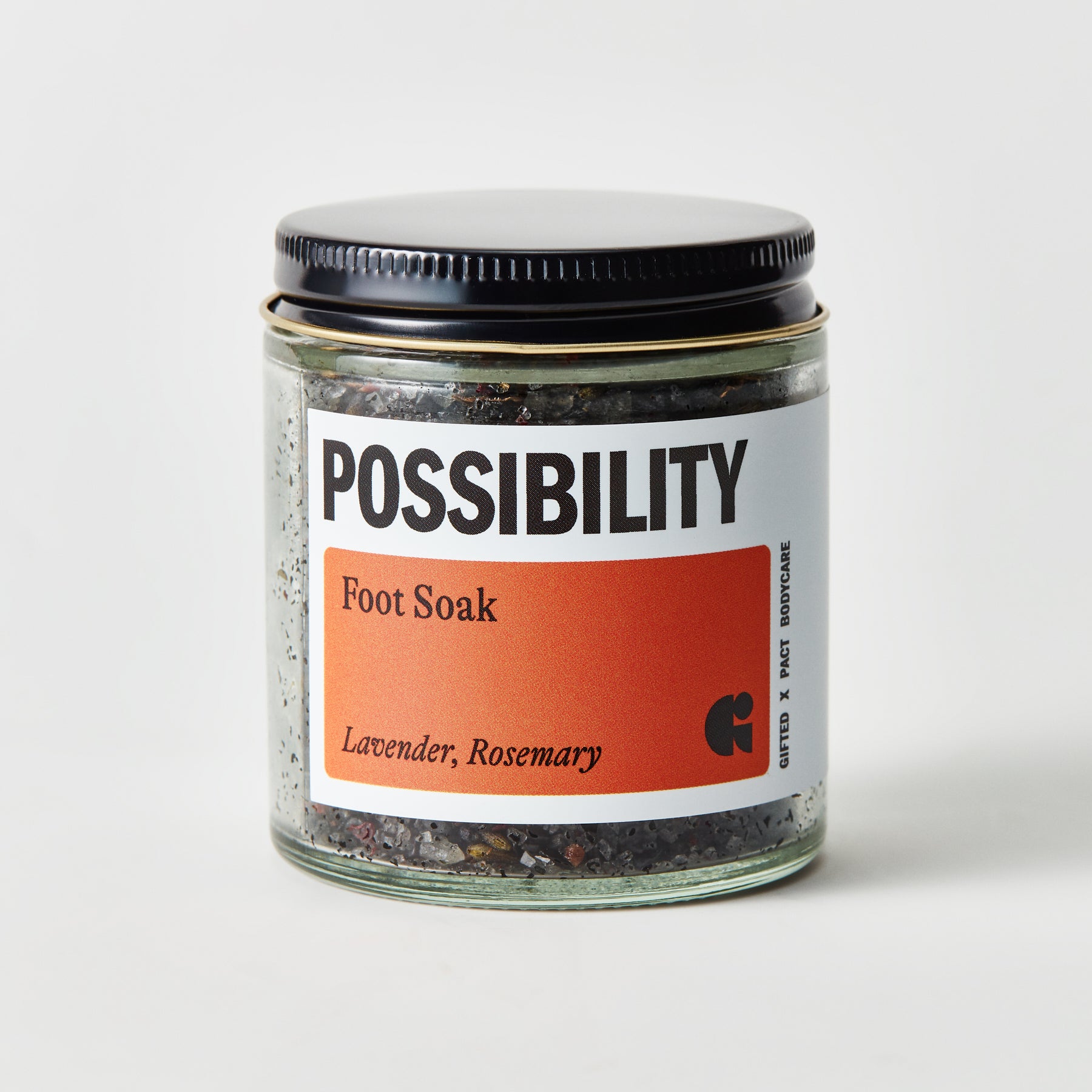 Possibility Foot Soak handmade by PACT Bodycare: Sea salt pairs with an invigorating blend of rosemary and lavender to unlock the possibility of your biggest dreams.Â
