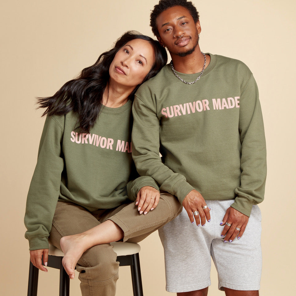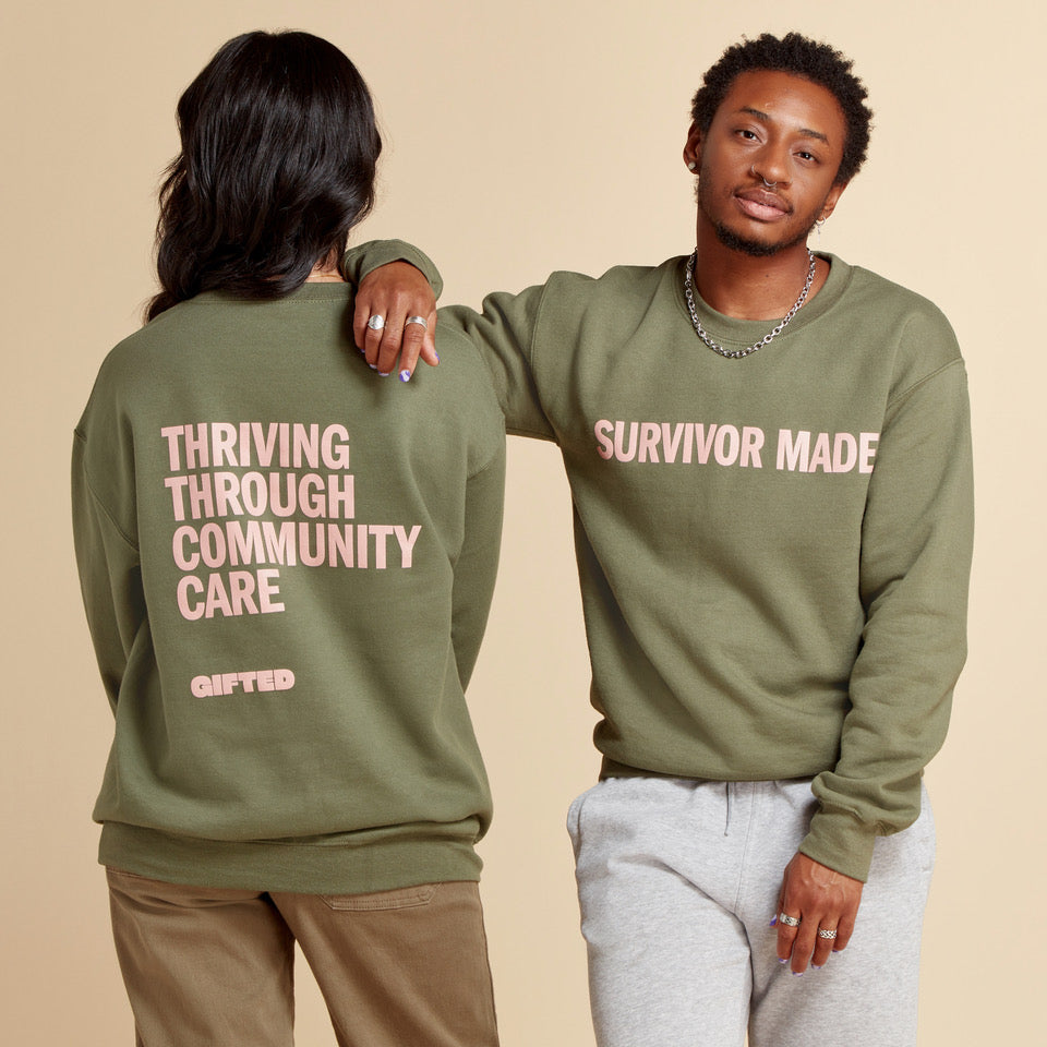 Celebrate the release of SURVIVOR MADE, an upcoming documentary about GIFTED, with this exclusive sweatshirt, honoring the resilience and creativity of survivors everywhere. Acknowledging that we all come from a lineage of survivors, this versatile piece can be dressed up or down, always transforming the narrative of gender-based violence—from pain to possibility. Be part of a movement that celebrates survivor wealth at survivormadedoc.com.